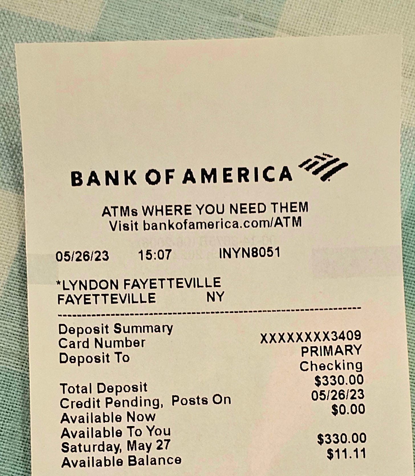 Today I deposited a paycheck (THANK GOD) in my bank, and the receipt came back with today's balance... '$11.11.'