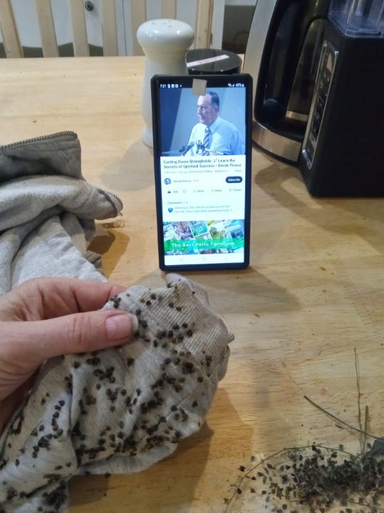 I started trying to pull the darn things out of my sweater at the kitchen table, and realize it was going to take a few hours.. SO - I POPPED A DEREK PRINCE MESSAGE ONTO MY PHONE AND HUNKERED DOWN.