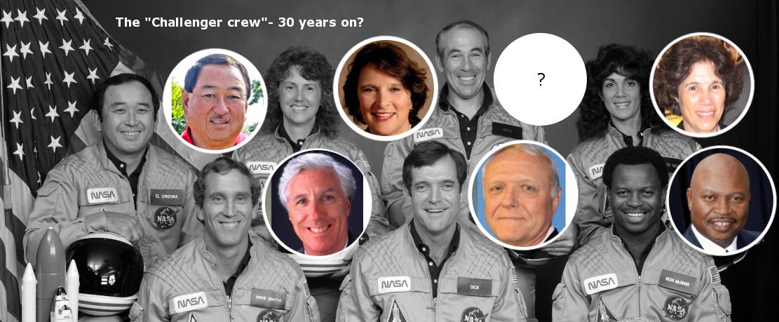 Take the Challenger crew that ‘died in the 1986 disaster’. Look at their photos then and now.. One of them became a professor at Syracuse University where I went to school.. Judith Resnick. (Top right). Another (bottom 2nd to right), opened a Graphic Studio, whose logo simulated the Challengers spiral in the sky.. A joke? Yes. On us.