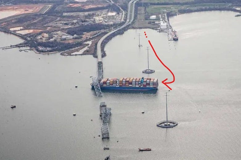 Look at the LENGTH of the ship. It could not have been cruising INSIDE of the tall Lights sitting in the water, and make such a turn without hitting them. It was outside of them, and heading parallel to the bridge - when it allegedly lost power momentarily.. Was that ‘fake excuse’ a pretext for this ‘accident’?