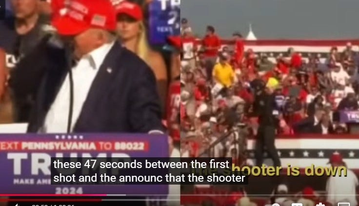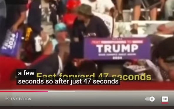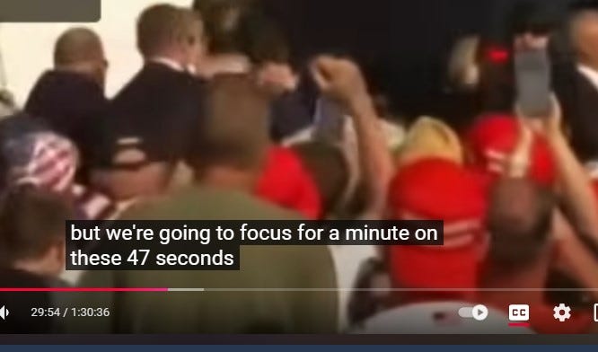 Next appearance of 47.. (minute 29) the film narrator/analyst (John) notes that Trump was ‘on the ground’ for ‘47’ seconds, before he stood up - an easy target position if there were ‘other shooters’,.. and started his dramatic ‘photo op’..