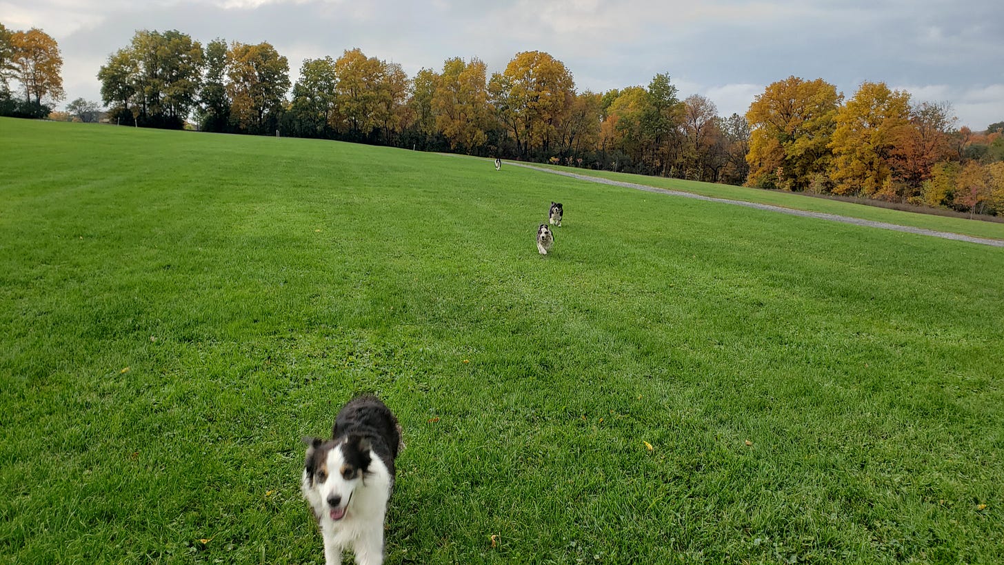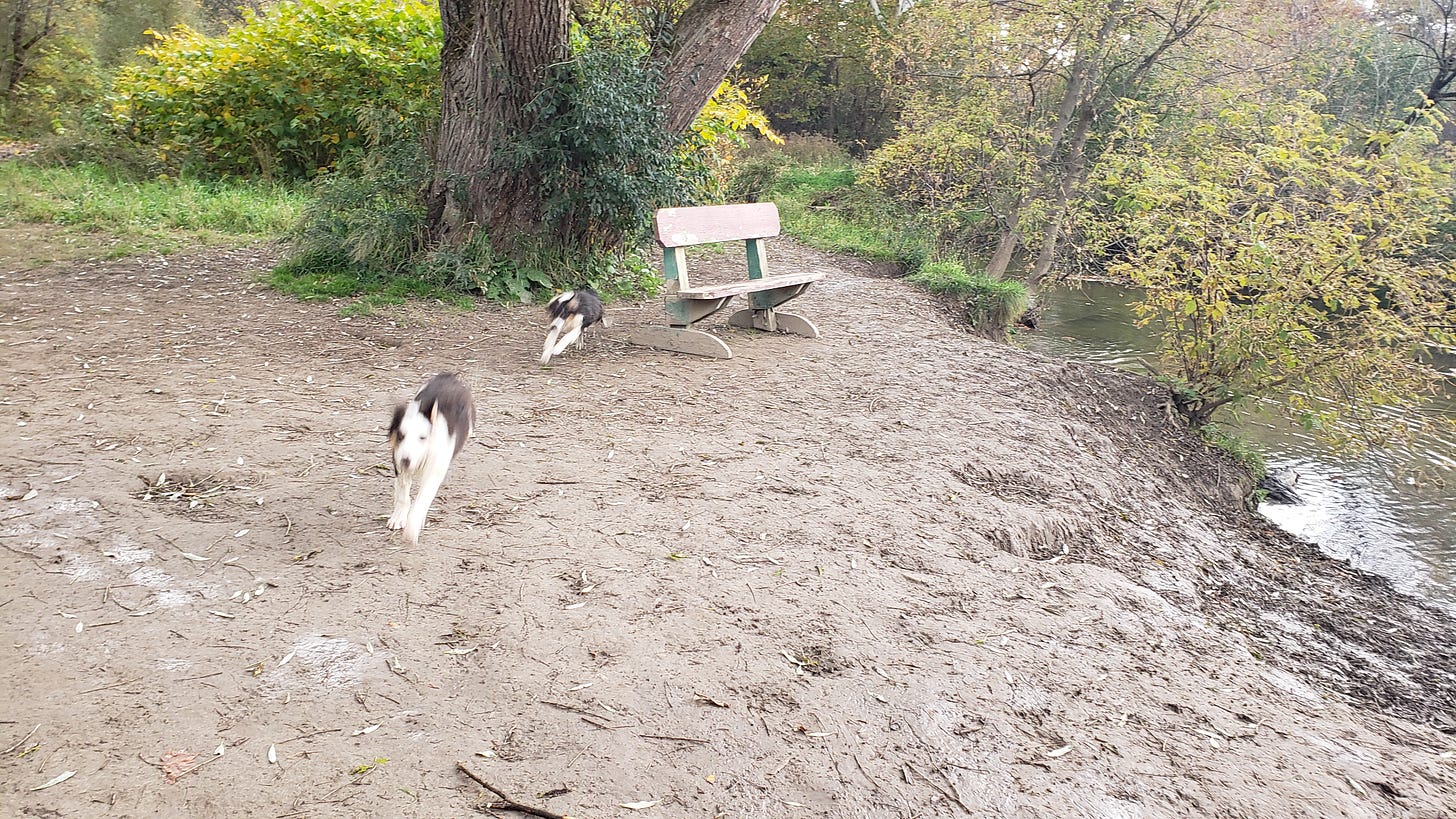 The path bottoms out at a riverlet, where the dogs like to wade and get wet. I met a lady who was down there with her 2 dogs.. one was a black & white French Bulldog. I noticed her shoes were black & white (she was wearing a cute black dress.. you never see women in dresses anymore.. It seemed odd that this was her outfit for walking her dogs in a possibly muddy part of a dog park!) So, I quipped that her dog matched her shoes. She laughed and we struck up a conversation..