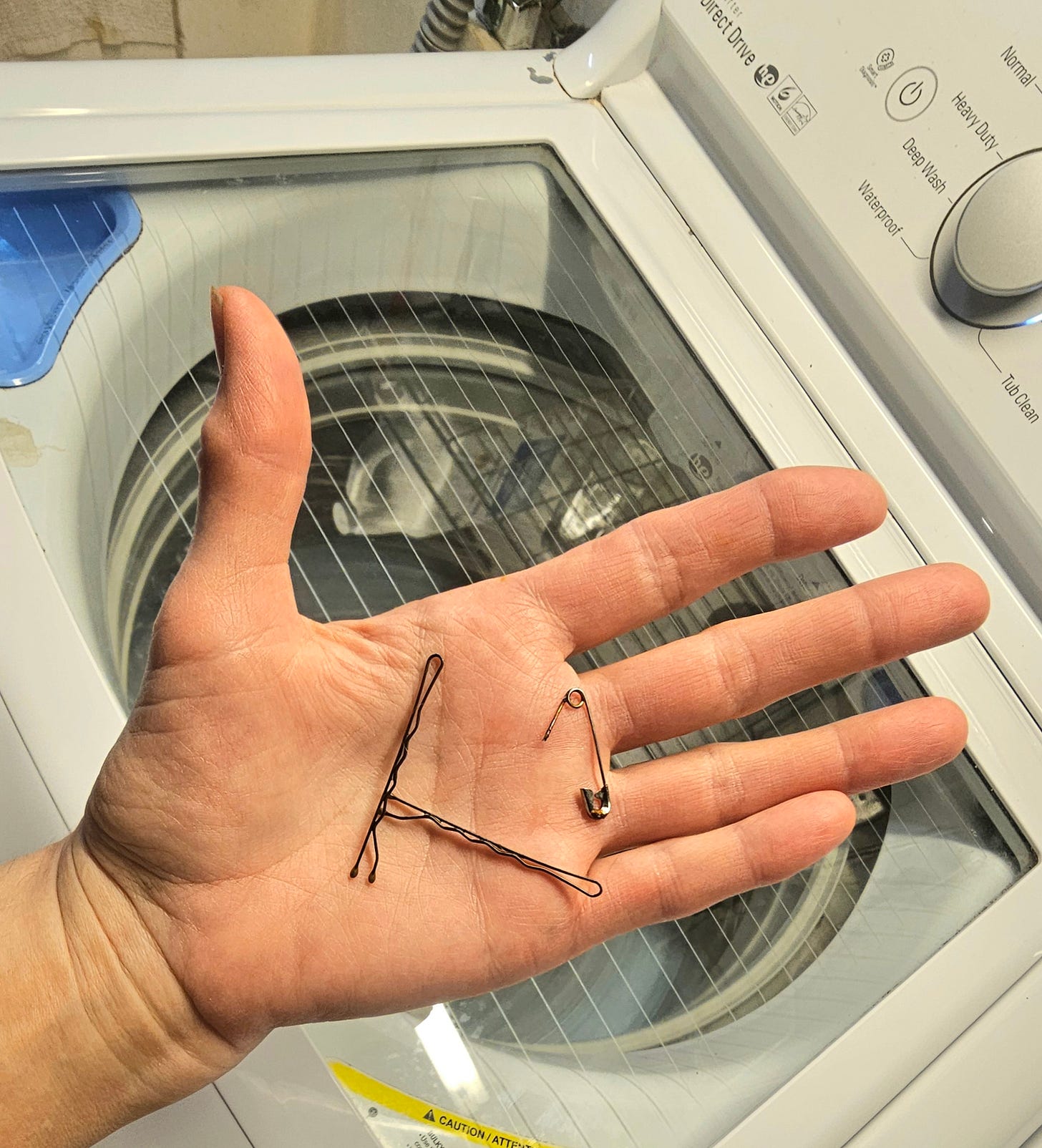 Last Sunday after everyone checked out, I put a load in the machine to wash - but even from upstairs in my office I could hear the telltale SCREECHING SOUND of a bobby pin stuck in the drum.. (Besides the terrible noise, the drum wouldn’t spin).
