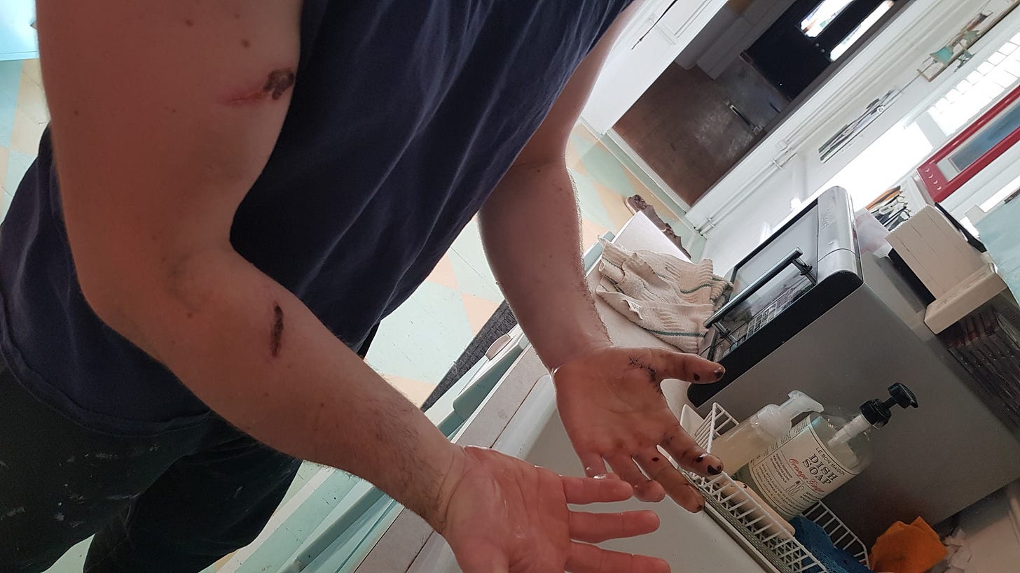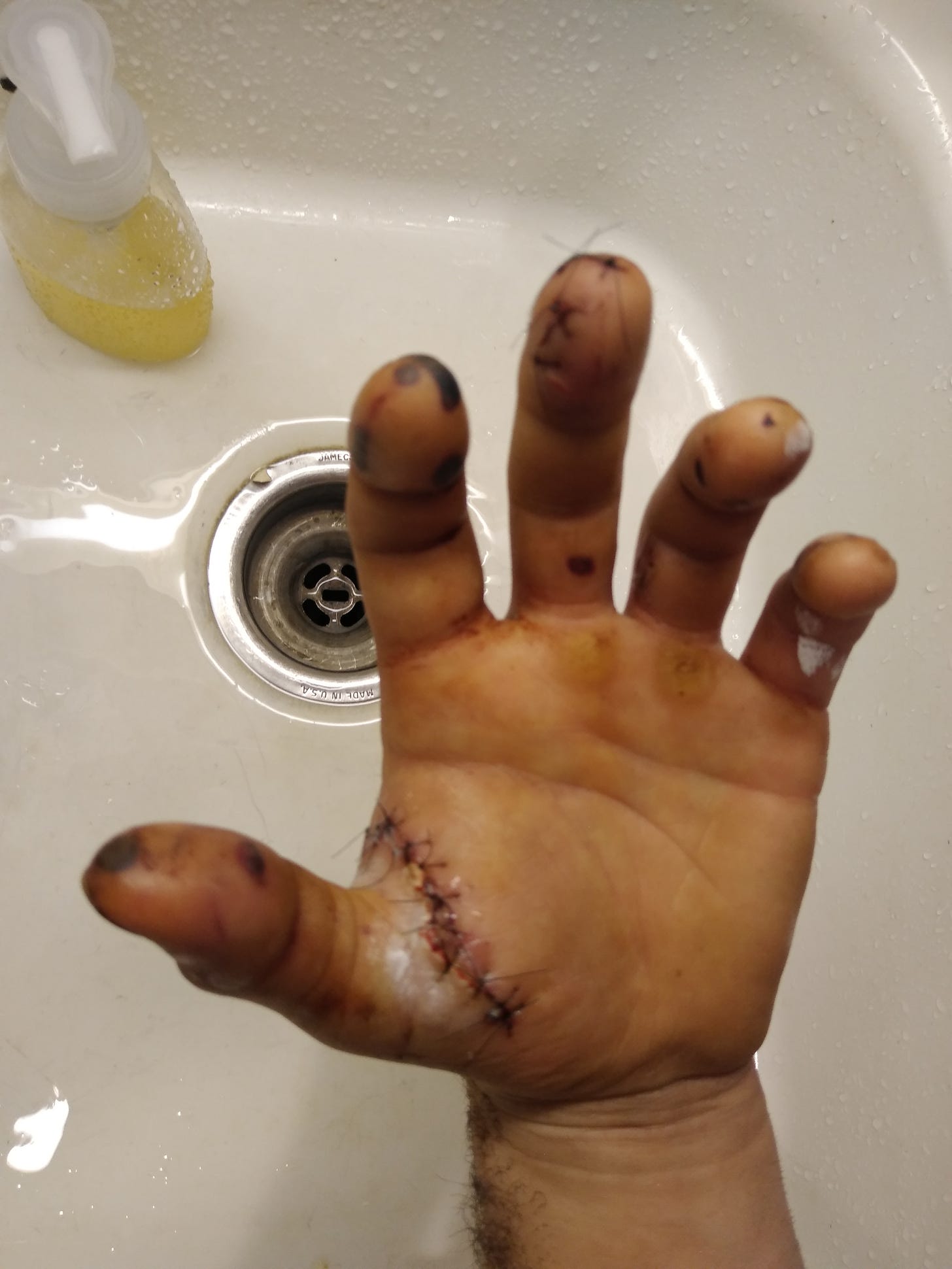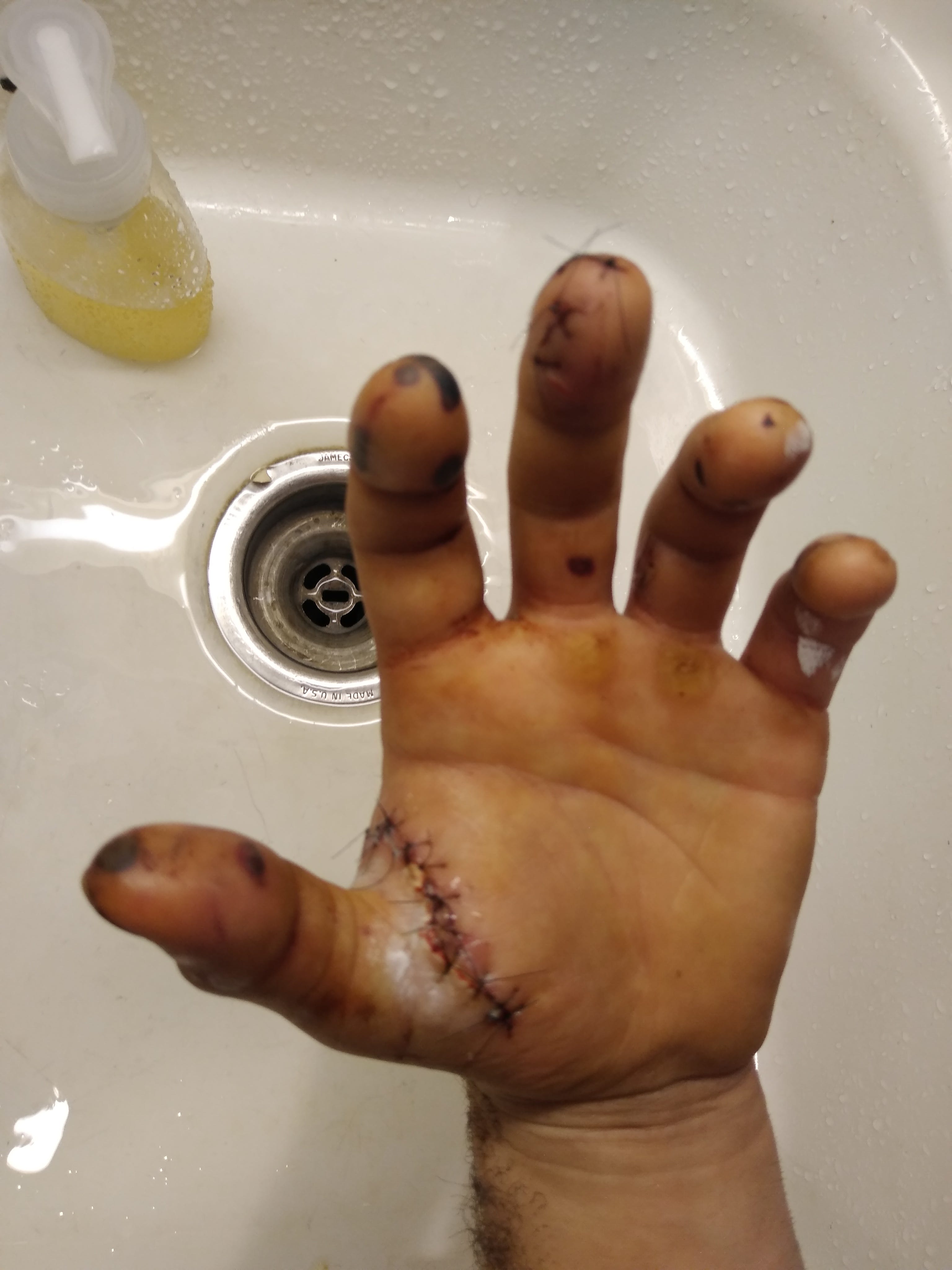 He drove home with 1 hand - blown wide open - curled in this lap. I wrapped his hand in a towel, poured the blood of Christ into his wounds and took him to the hospital for what became 17 stitches.