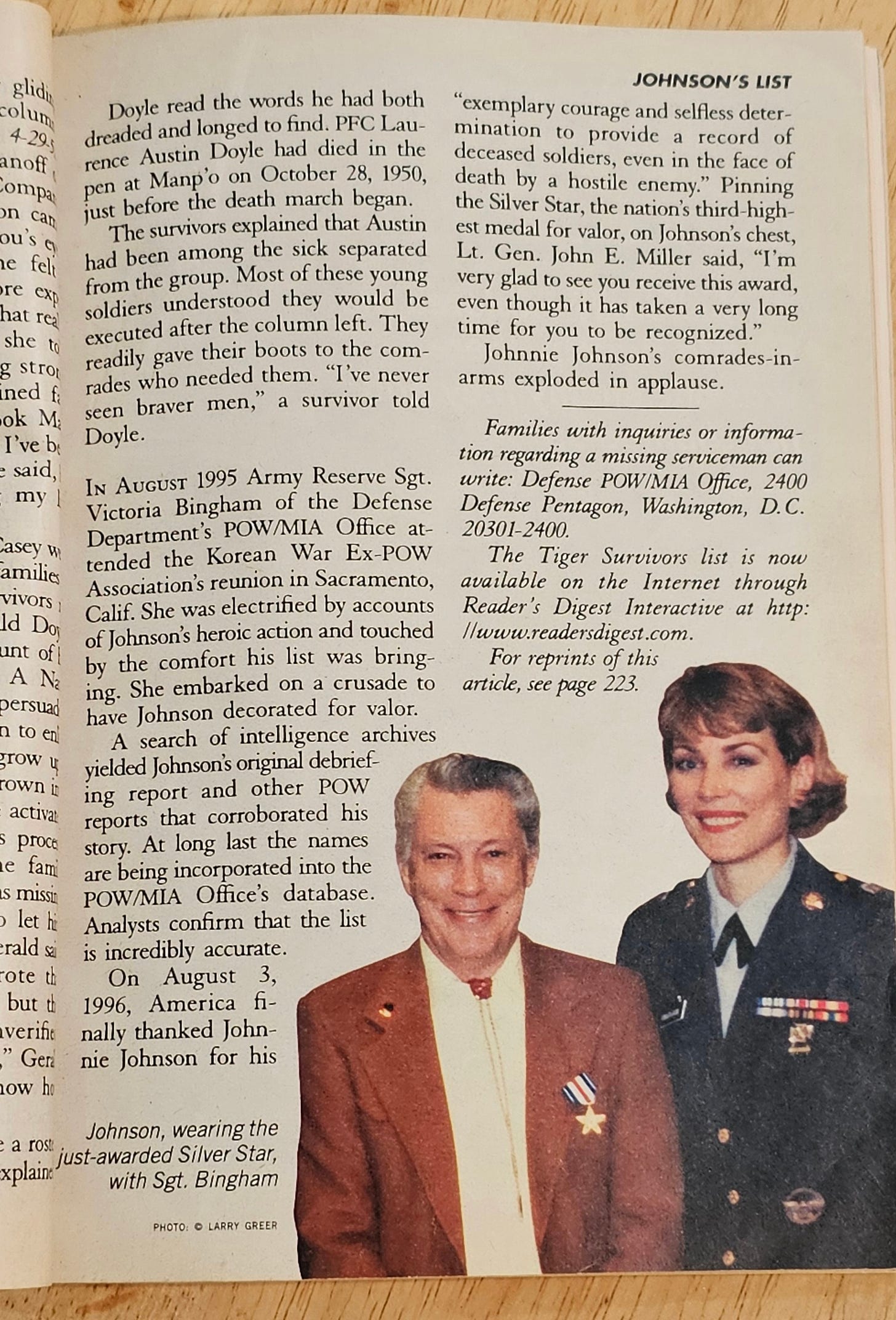 My efforts to get him recognized led to Johnny being pinned with an Army Silver Star -by a 3 Star General - at the 1996 Korean War POW Veteran Reunion, in Schraumberg IL, in front of 800 of his POW peers, as well as his 86 year old mother and siblings! Johnny was 69 at the time! Johnny stayed in touch with me till the day he died, and told me I’d ‘saved his life’.